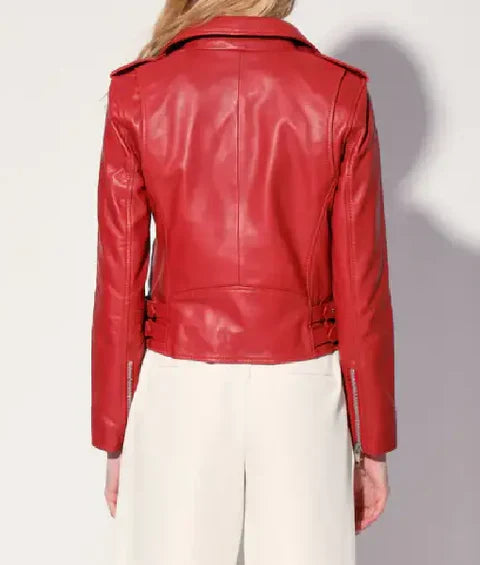 This jacket features classic biker details—an asymmetrical front zip closure, notched lapel collars, and metallic accents that make it stand out. The soft inner lining ensures comfort, making it as practical as it is stylish. Whether paired with skinny jeans for a sleek casual look or layered over a dress for a more refined vibe, this jacket delivers unmatched versatility.